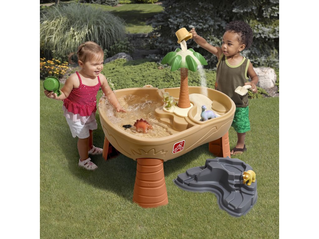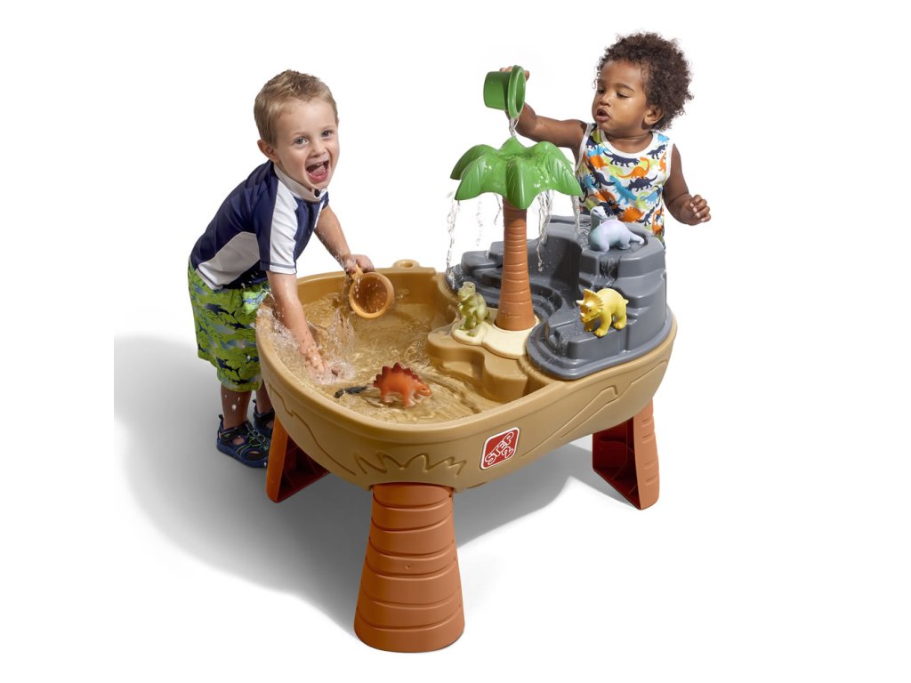 - uprostřed stolu krásná palma, nalijte vodu na palmu a spusťte déšť na dinosaury